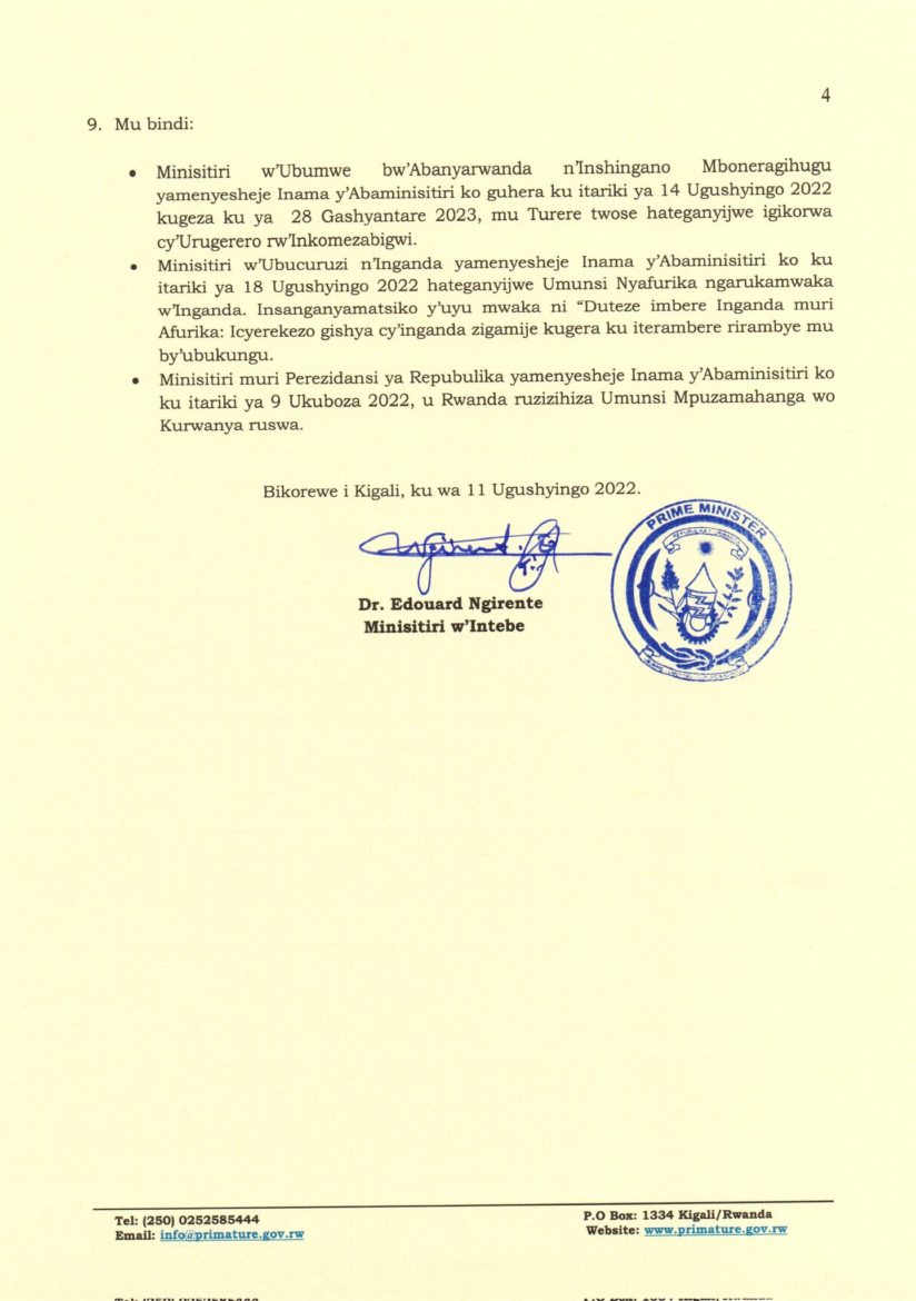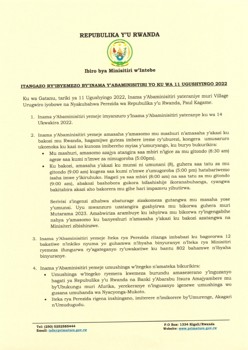 Iryo tangazo rigaragara mu myanzuro y’Inama y’Abaminisitiri rivuga ko amasaha y’amasomo mu mashuri n’amasaha y’akazi ku bakozi bo mu Rwanda yahindutse, hagamijwe guteza imbere ireme ry’uburezi, kongera umusaruro ukomoka ku kazi no kunoza imibereho myiza y’umuryango.