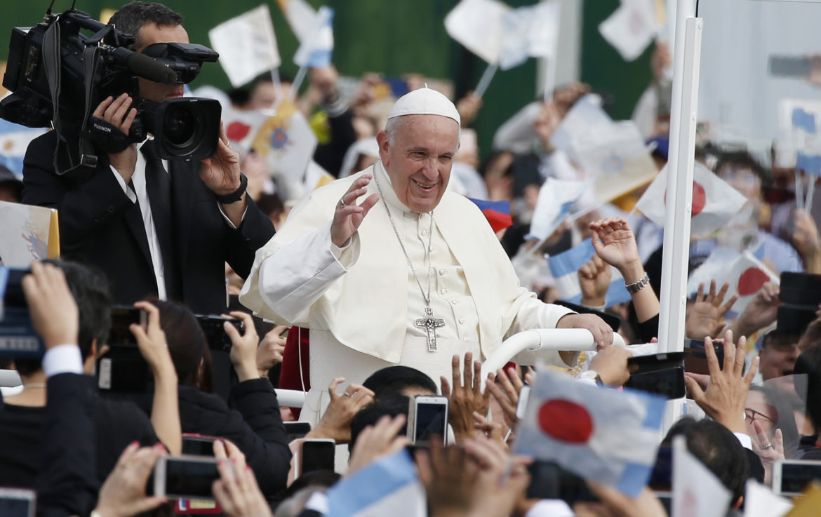 Pope Francis greets the crowd before celebrating Mass at the baseball stadium in Nagasaki, Japan, Nov. 24, 2019. (CNS photo/Paul Haring) See stories slugged POPE-JAPAN Nov. 23, 2019.