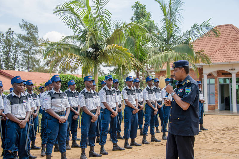 Ati: “Kugira amakenga mu kazi ni byiza kuko bigufasha kugenzura neza no kubona amakuru ku byahungabanya umutekano w’aho ushinzwe kurinda. Mujye murangwa n’ubushishozi bizabafasha gusaka neza, kandi mutange amakuru ku bayobozi banyu ku byo mubona bishobora guhungabanya umutekano.”
