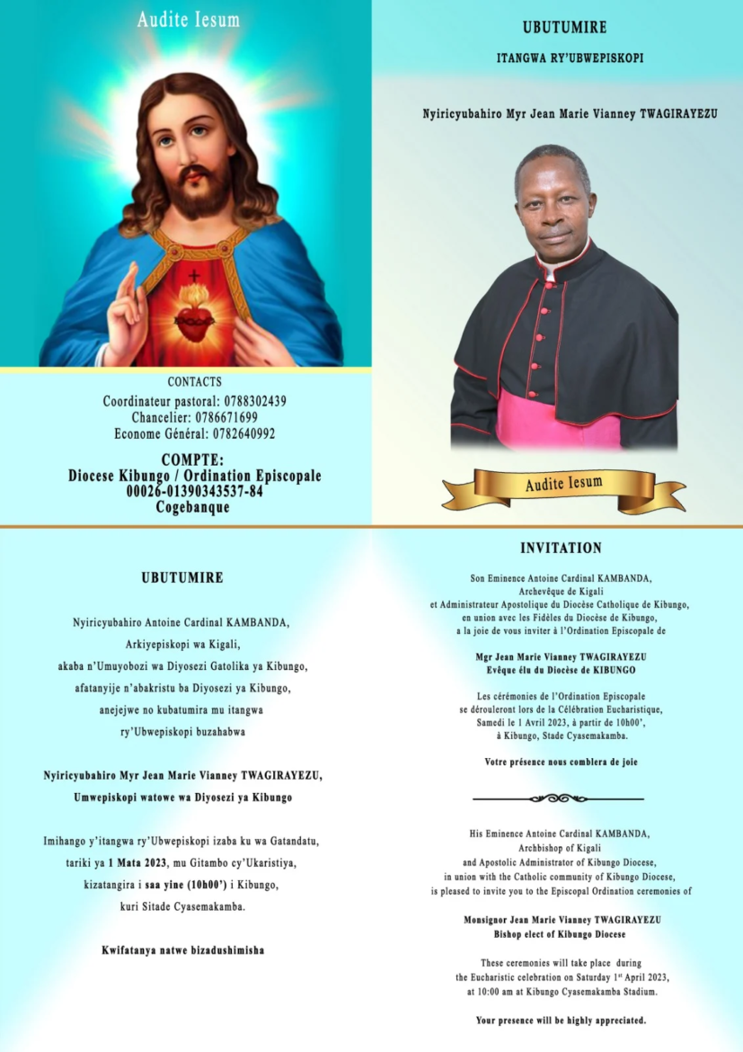 Ni mu butumire Antoine Cardinal Kambanda, Arikiyesikopi wa Kigali akaba n’umuyobozi wa Diyosezi ya Kibungo, yamaze gushyira ahagaragara, aho buvuga ko afatanyije n’abakirisitu ba Diyosezi ya Kibungo, anejejwe no gutumira abantu mu itangwa ry’Ubwepisikopi buzahabwa Nyiricyubahiro Myr Jean Marie Vianney Twagirayezu.