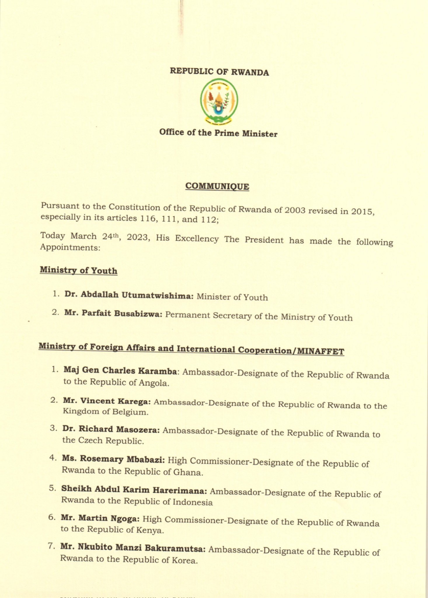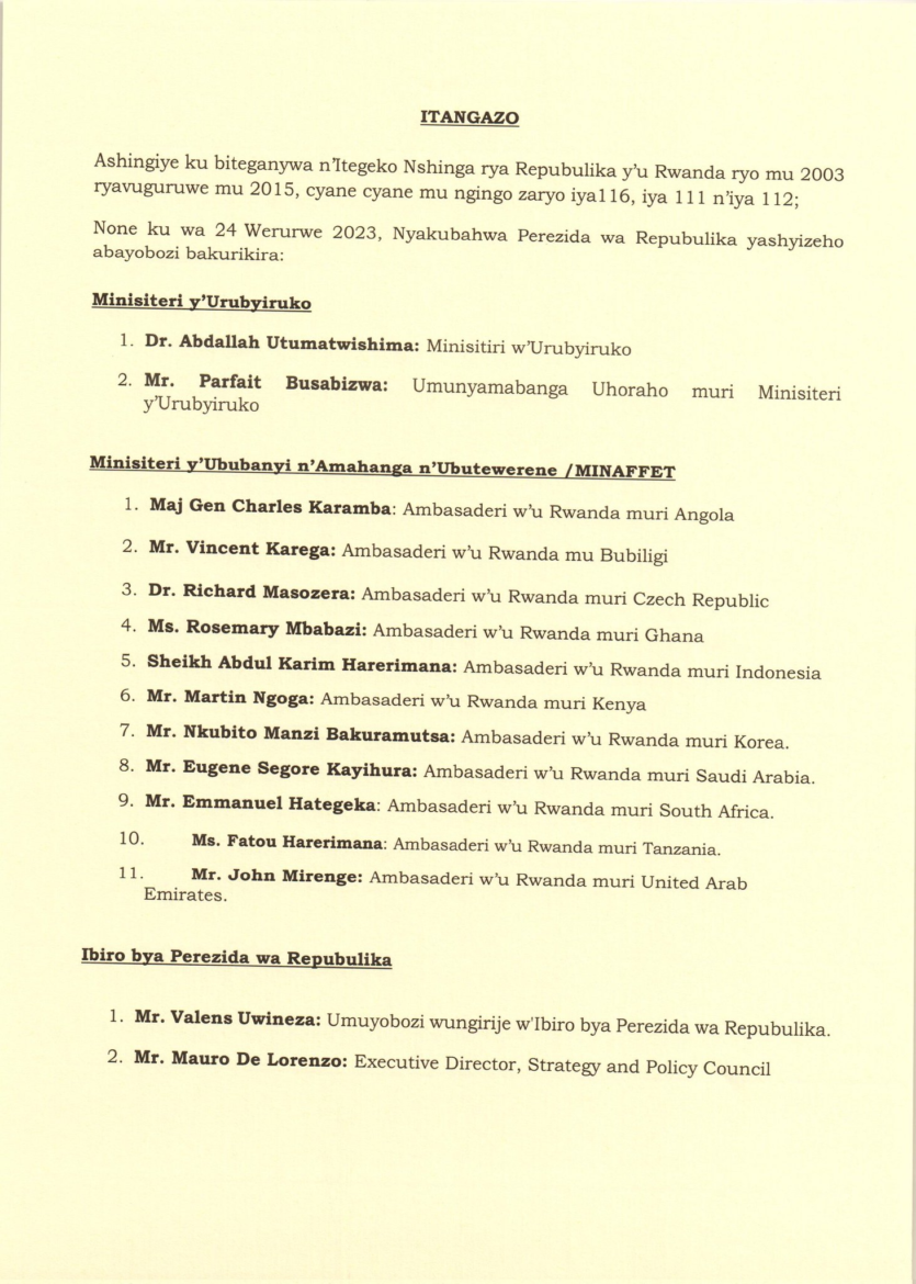 Muri iryo tangazo rimwe ryaturutse mu biro bya Minisitiri w’intebe, rigaragaza ko hashyizweho abandi ba ambasaderi n’abahagarariye inyugu z’u Rwanda mu bindi bihugu batandukanye.