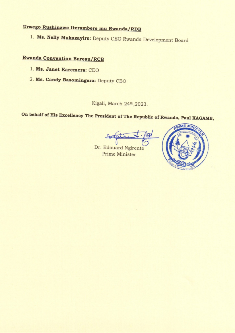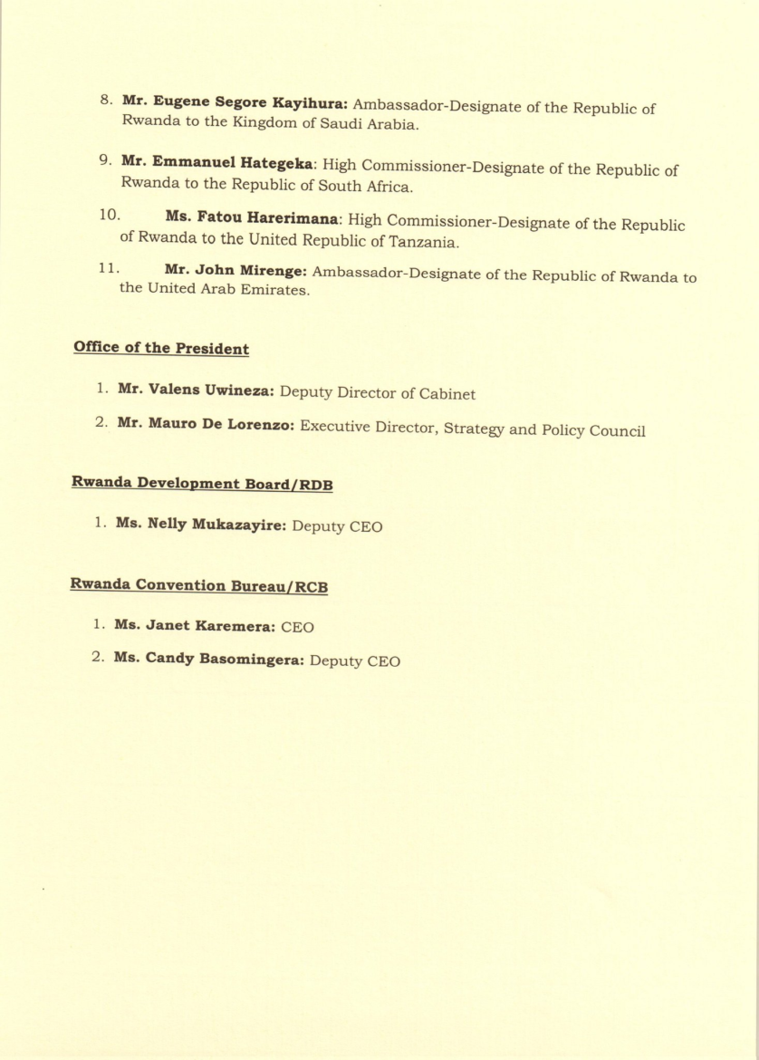 Mu bandi bahawe inshingano Valens Uwineza wagizwe Umuyobozi wungirije w’Ibiro bya Perezida wa Repubulika na Mauro De Lorenzo wagizwe Umuyobozi ushinzwe ishyirwa mu bikorwa rya gahunda mu Biro by’Umukuru w’Igihugu.