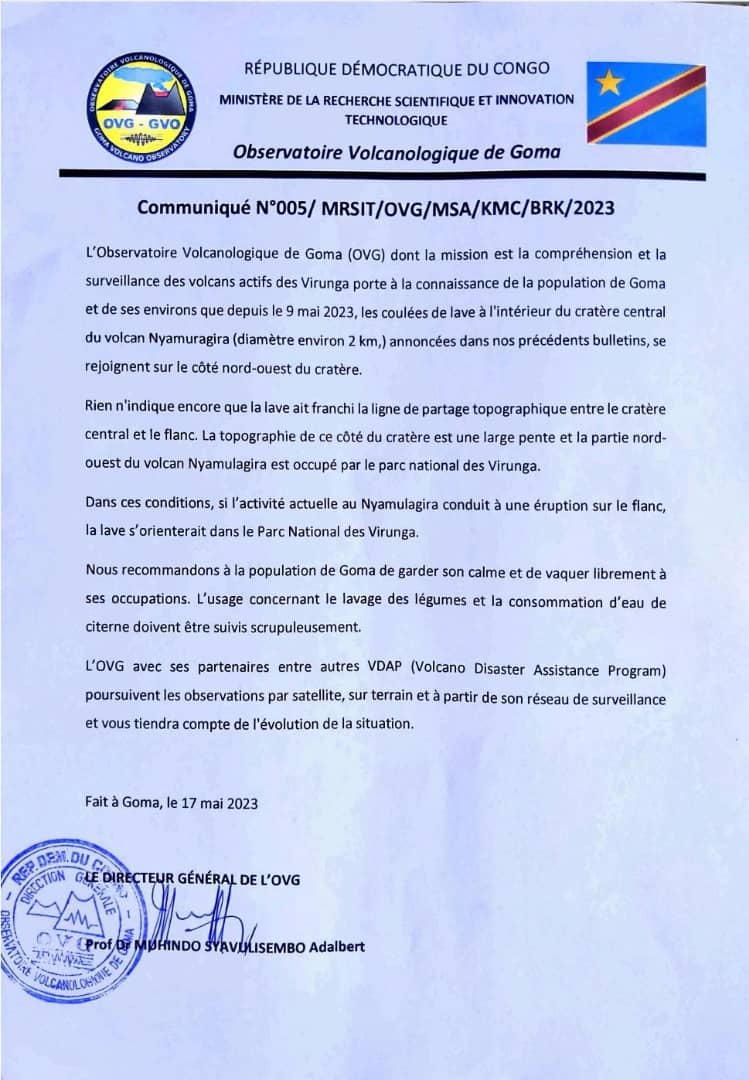 Bwagize buti “Turamenyesha abatuye Umujyi wa Goma no mu nkengero zaho ko amahindura (ibyo ikirunga kiruka) arimo kwisuka mu Kirunga cya Nyamulagira gifite umurambararo w’ibirometero bibiri. Ni amahindura yerekeza mu Burengerazuba bw’Amajyaruguru kandi ntiturabona ibihamya ko amahindura yarenze umunwa w’ikirunga.”