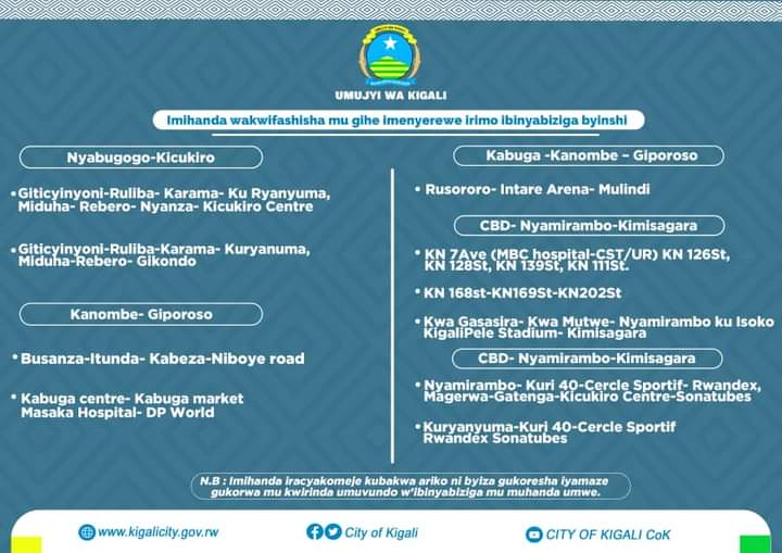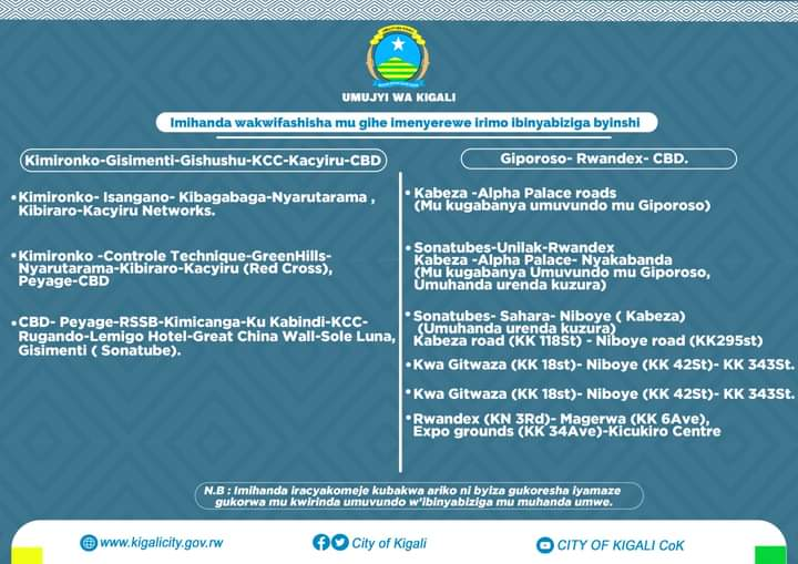 Uwo muntu kandi ashobora no guhitamo kumanukira kuri Contrôle Technique, Green Hills, Nyarutarama (Kibiraro), Kacyiru(Croix Rouge), Kimicanga, Peage kugera mu Mujyi.
